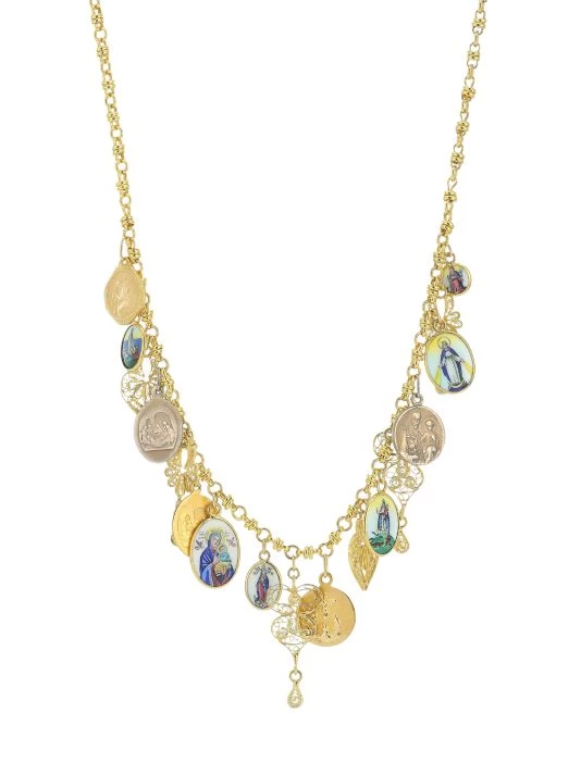 Elegant yet dramatic charm-style necklace crafted with yellow and white gold and antique enamel medals with intricate filigree decorations.