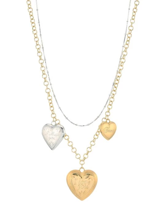 Necklace in yellow and white gold with two chains and three heart pendants.
