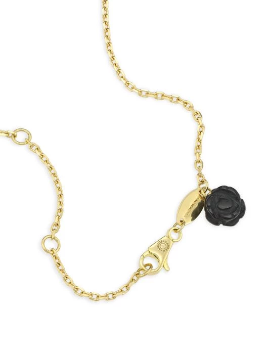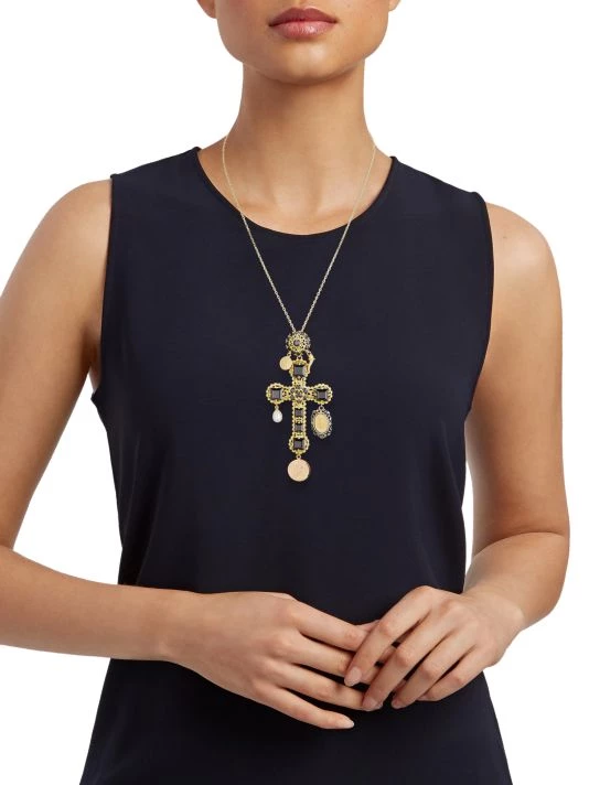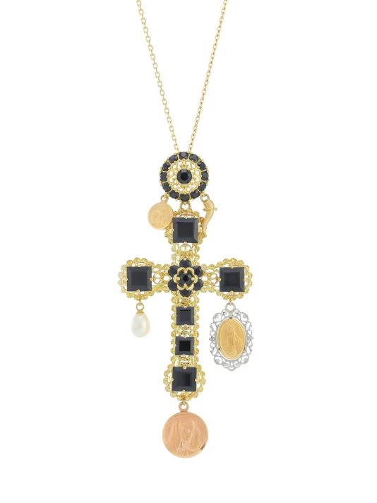 Signature cross pendant adorned with a stunning array of details including black sapphires, medals, cherub angel, good luck horn and pearl on a yellow gold chain.