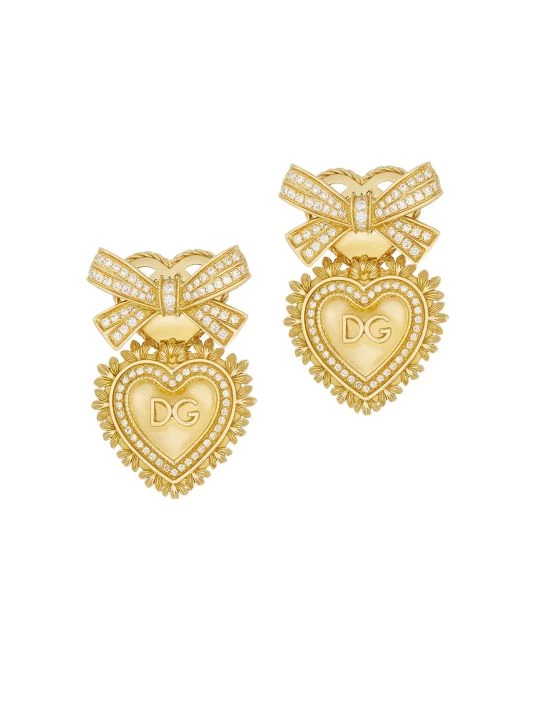 Ornate earrings cast in glowing 18K yellow gold with diamond detail featuring an elegant bow and the magnificent sacred heart, symbol of unconditional love and faith. The D&G logo is engraved inside the heart.