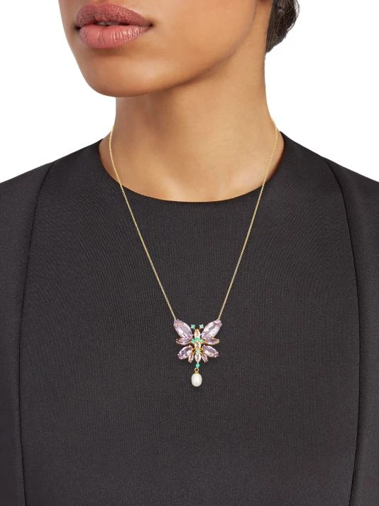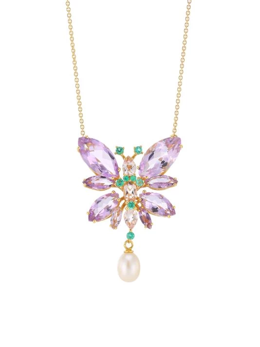 Yellow gold necklace with a butterfly-shaped pendant crafted of navette-cut amethyst quartz, drop-shaped and oval-cut morganites, brilliant-cut emeralds, and freshwater drop pearls.