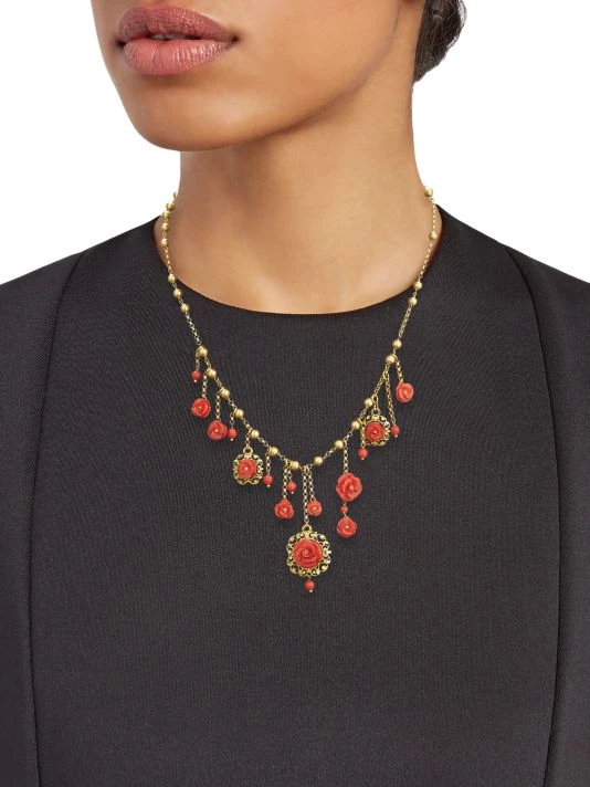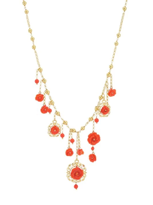 A romantic array of carved coral rose pendants create a statement-making design crafted with yellow gold.
