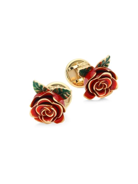 Highly-detailed rose cufflinks crafted in yellow gold with ruby and enamel detailing.