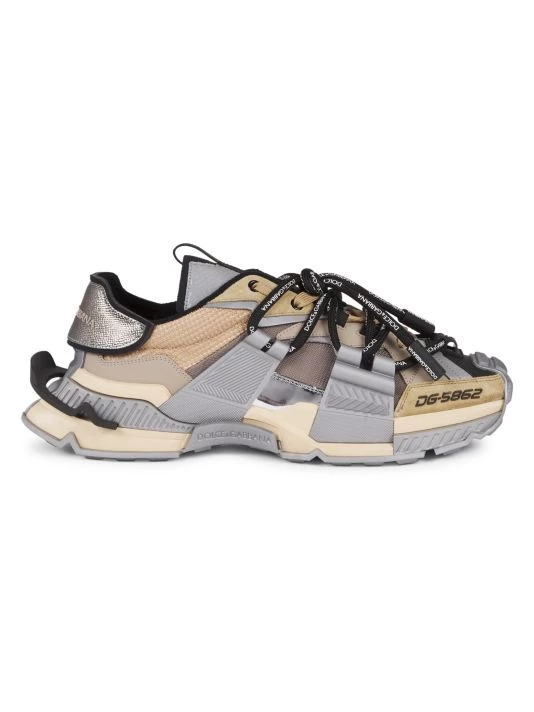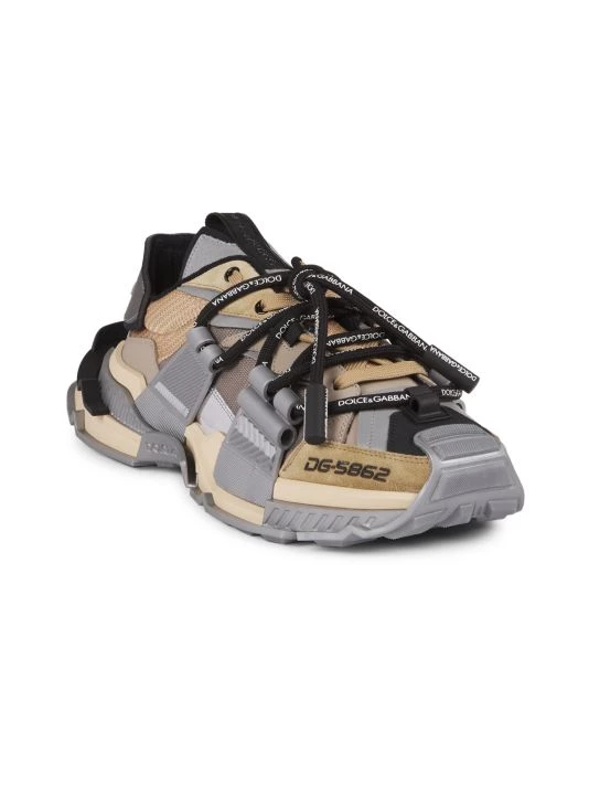 Reflecting the label’s new modern vision, Dolce & Gabbana’s sneakers are made of leather and feature multiple laces in a dramatic layered pattern. These shoes are finished with a chunky rubber sole and maintain an oversized silhouette.