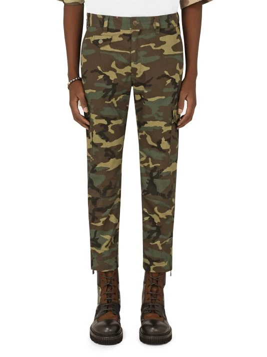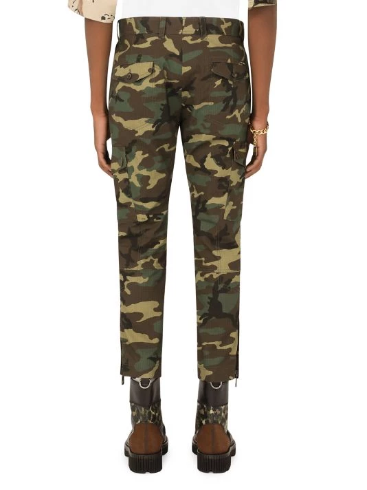 Camo pants crafted of ripstop cotton featuring cargo pockets and lower leg zips.