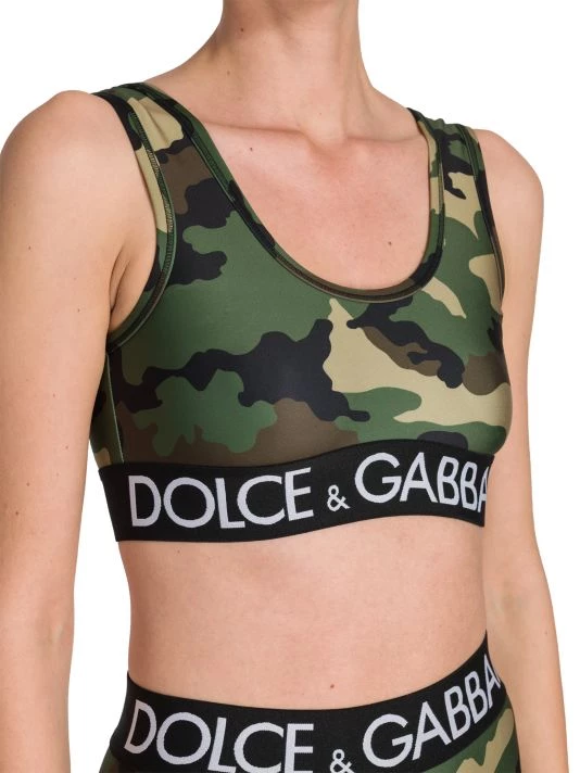 Dolce & Gabbana’s stretch sports bra features a classic camouflage print. A scoopneck and banded logo hem enhance the classic style.