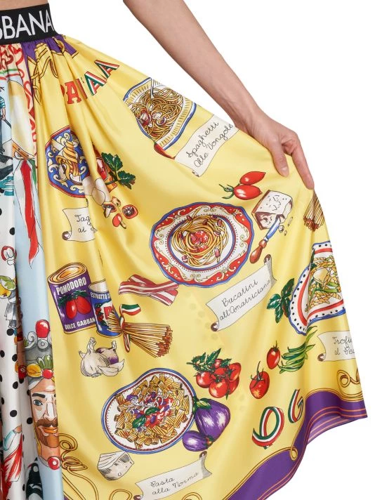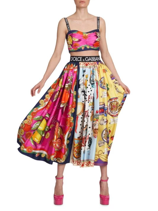 From the Capri Collection. DOLCE&GABBANA’s pleated midi-skirt is crafted of luxe silk. Boasting a flared silhouette, the style is elevated by a banded logo waist and mixed paneled prints.