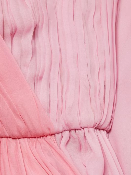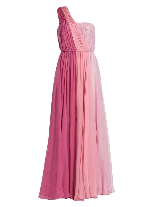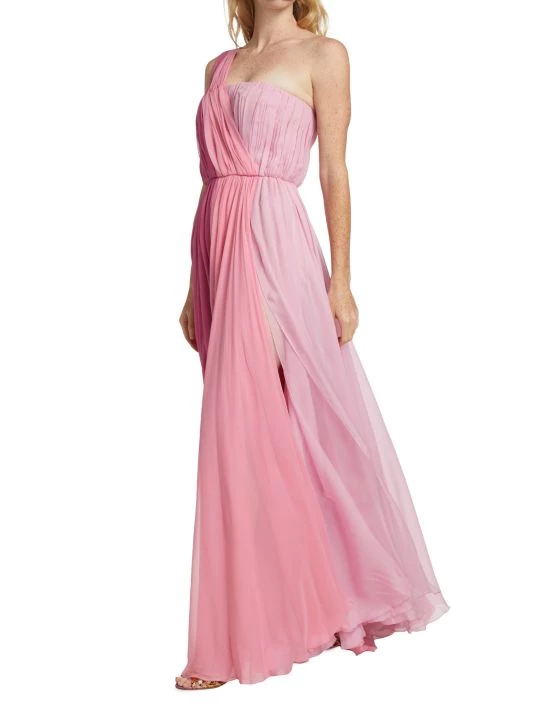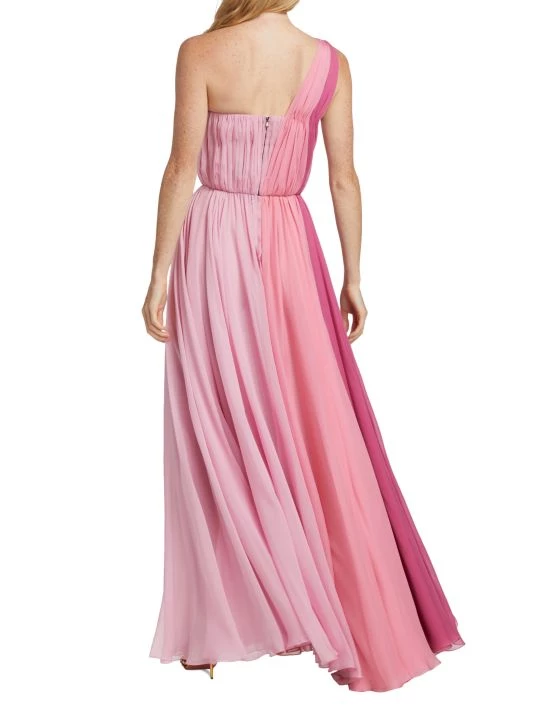 From the Collection W Collection. Pleated chiffon colorblock gown with a one-shoulder neckline and front slit.