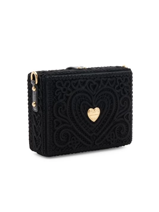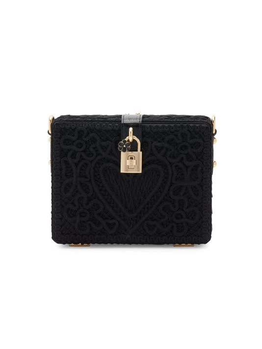 This lace box bag is designed with a faux lock closure with a removable DG logo shoulder strap.