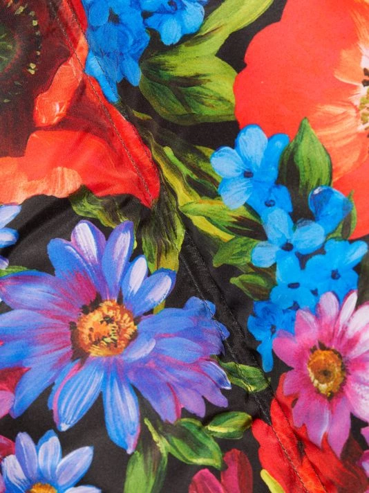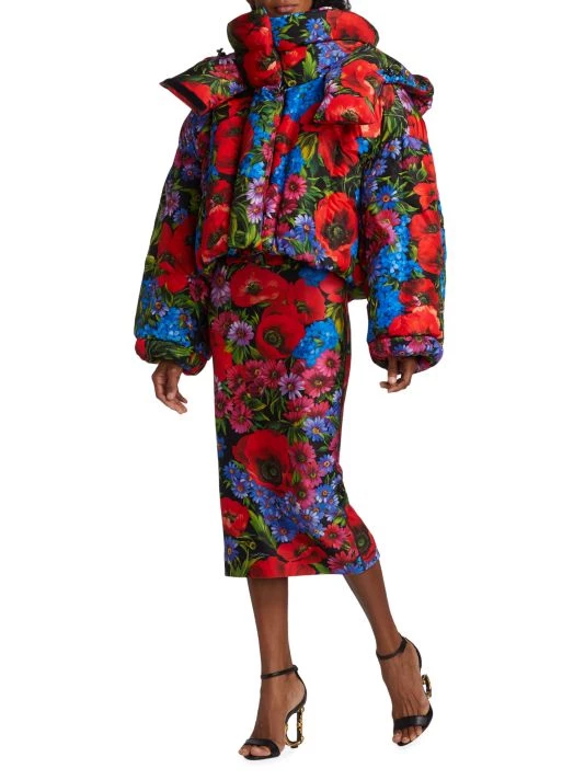 DOLCE&GABBANA’s hooded puffer jacket boasts a large painterly floral print and an oversized fit.