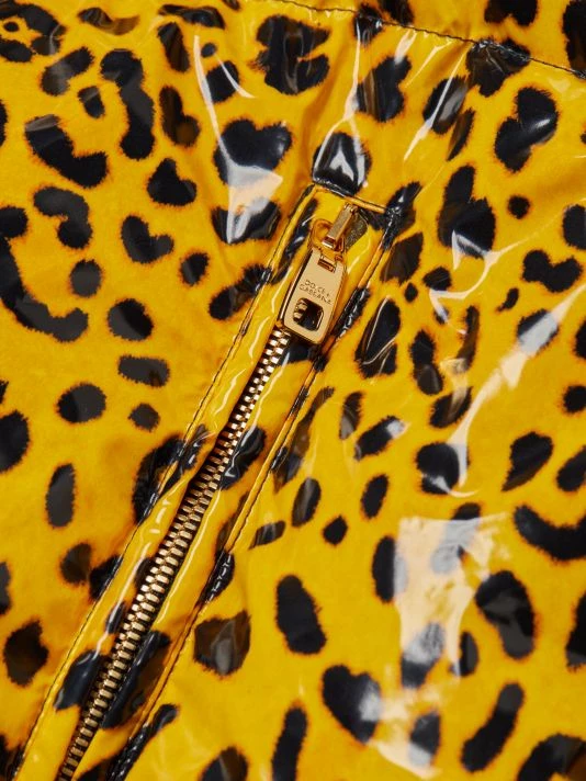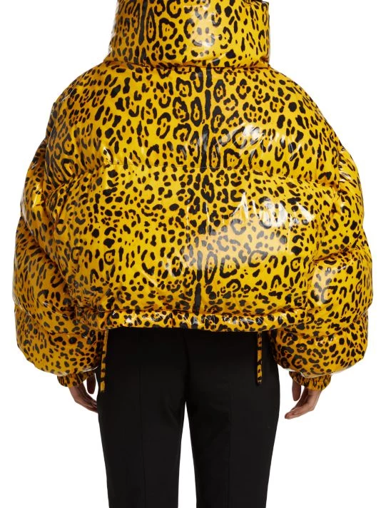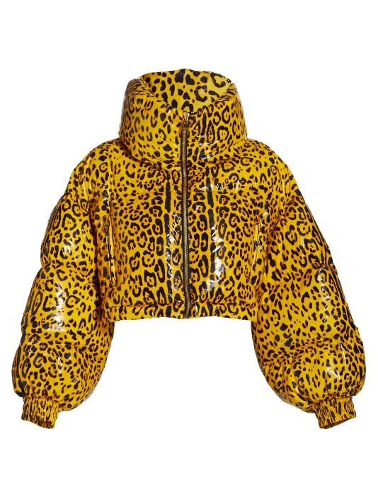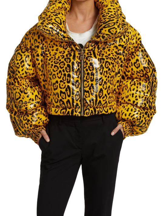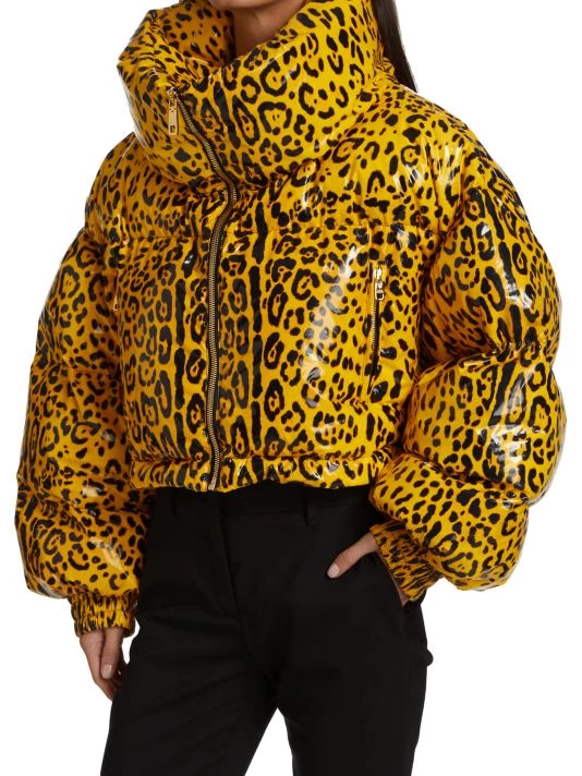 Lustrous puffer coat in a cropped silhouette with allover leopard print.