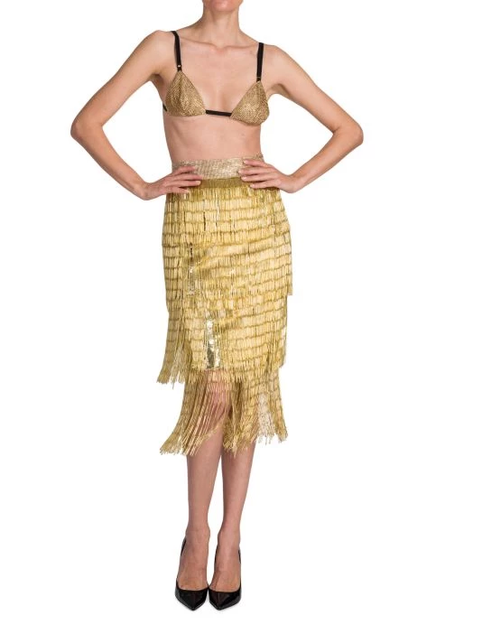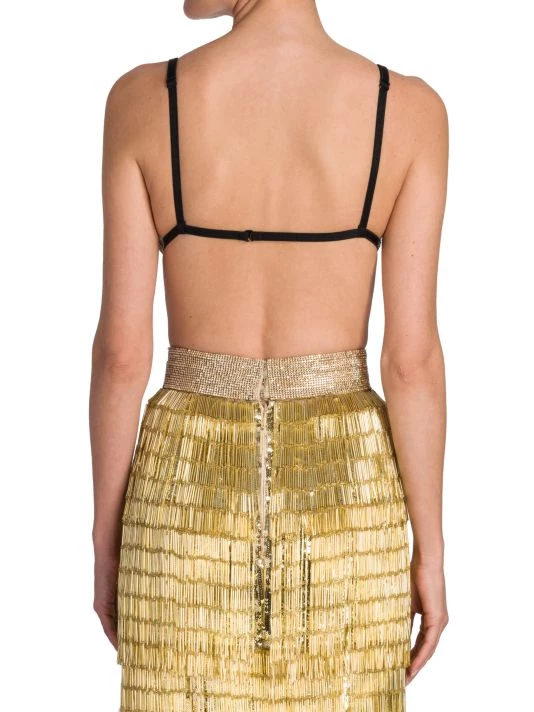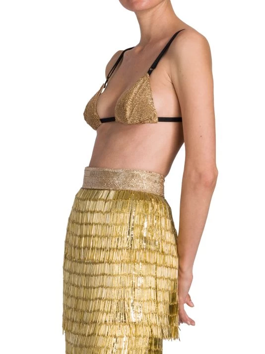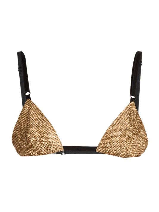 This shimmering bra top has a classic triangle cup, crafted of crystal and brass mesh and silk adjustable straps.