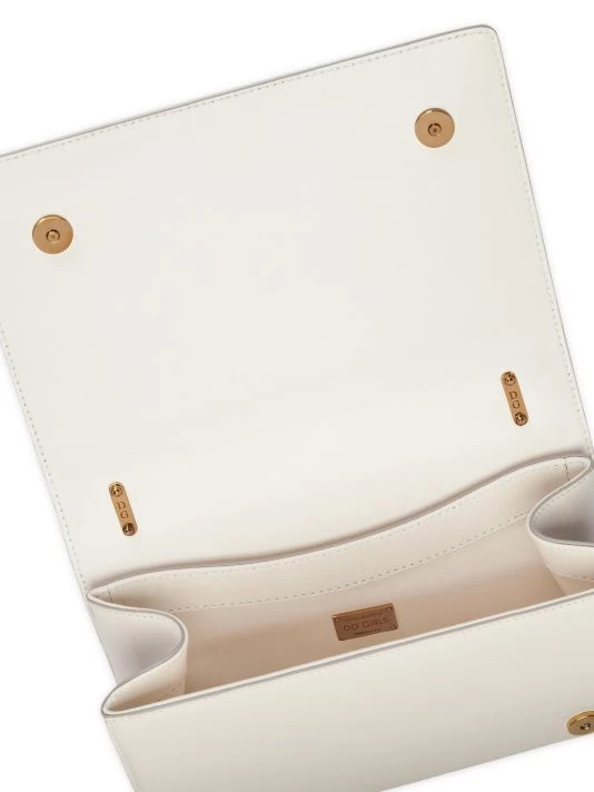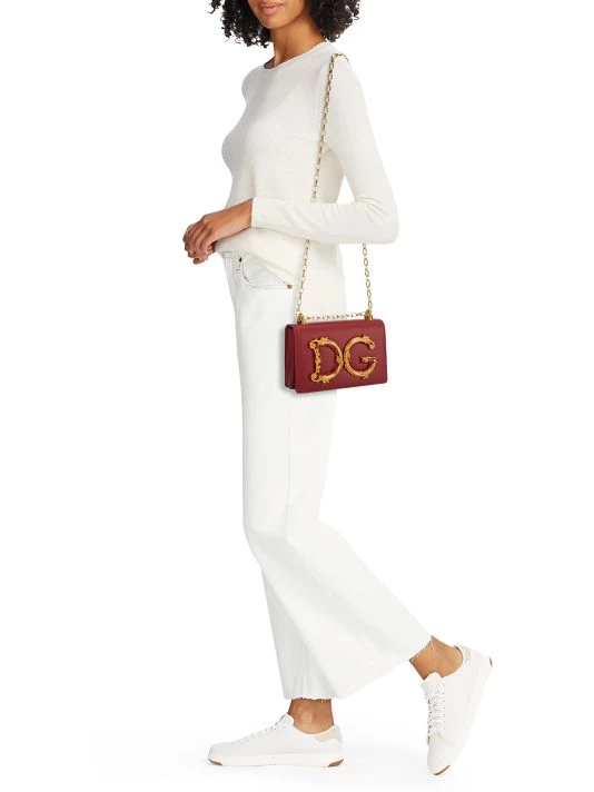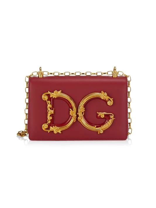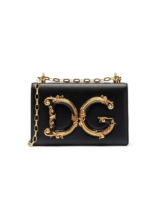 Striking goldtone logo adorns this structured leather shoulder bag with chain strap.