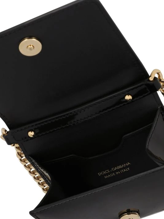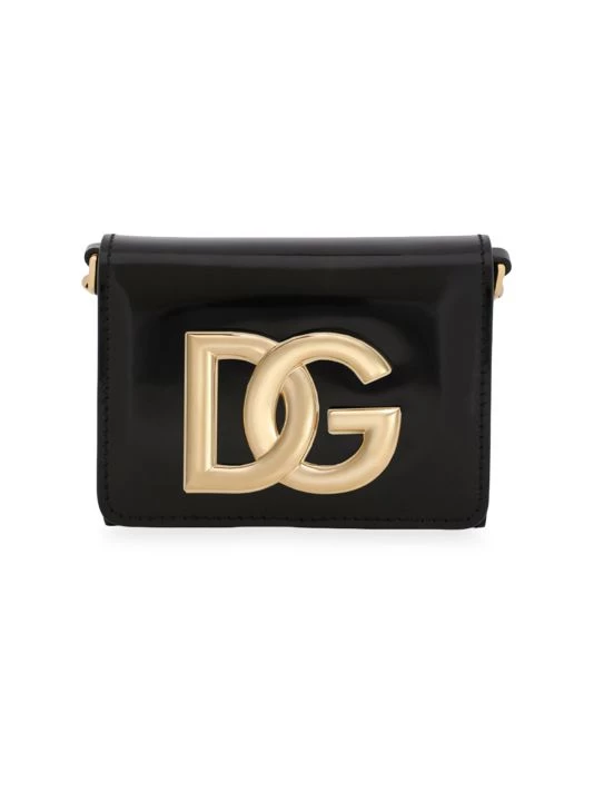 This patent leather mini bag is adorned with a DG logo plaque and a removable chain-link strap.