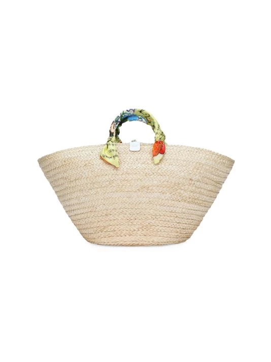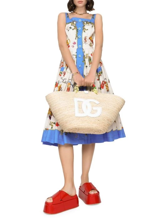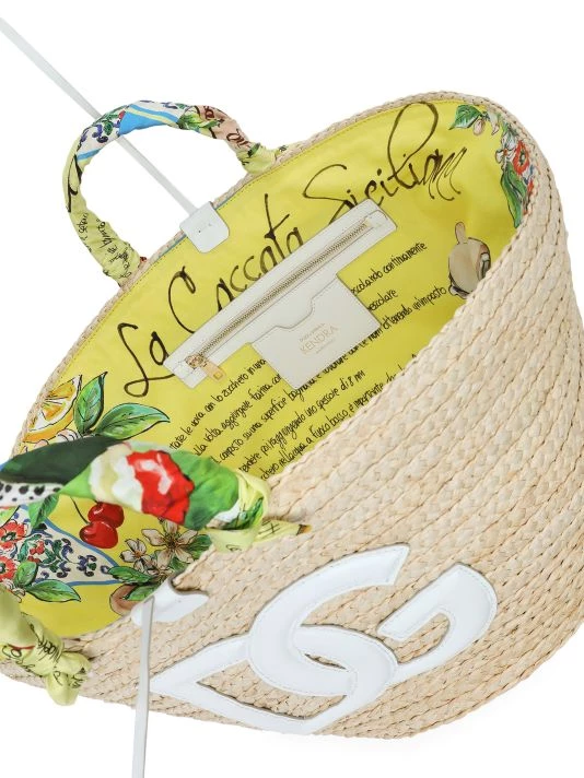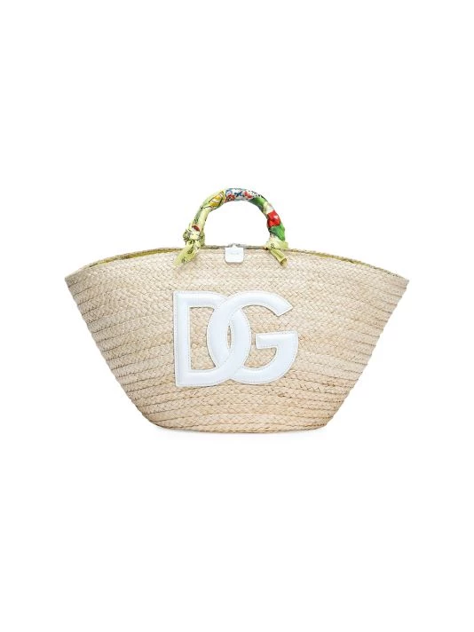 Topped with silk scarf-wrapped handles, DOLCE&GABBANA’s oversized basket tote is made in Italy of woven raffia. This piece is punctuated with signature interlocking DG leather patches.