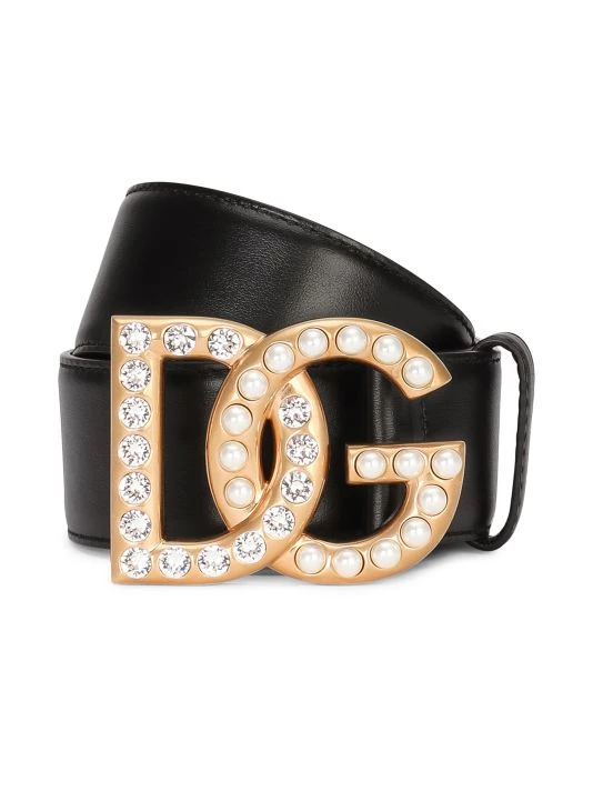 Shimmering swarovski crystals and beaded embellishments adorn the signature DG buckle of this smooth leather belt.
