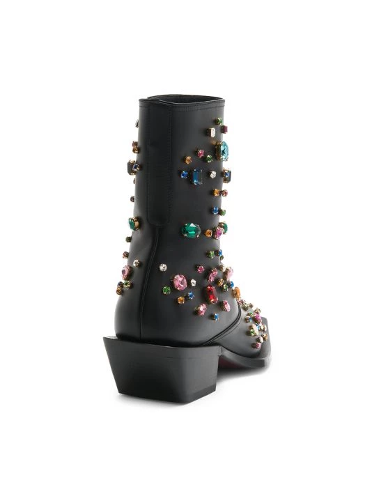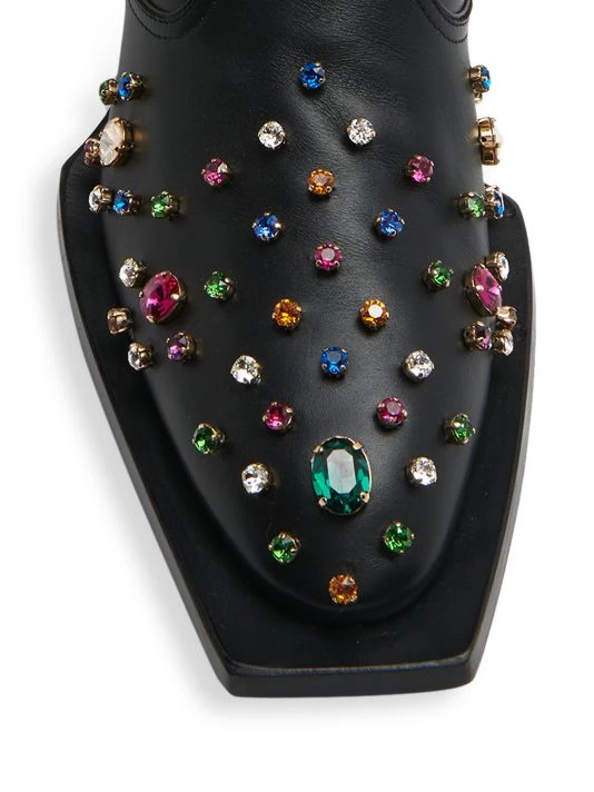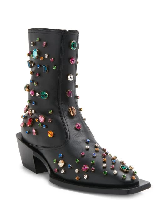 Made of leather, these square-toed boots feature dramatic stoned embellishments.