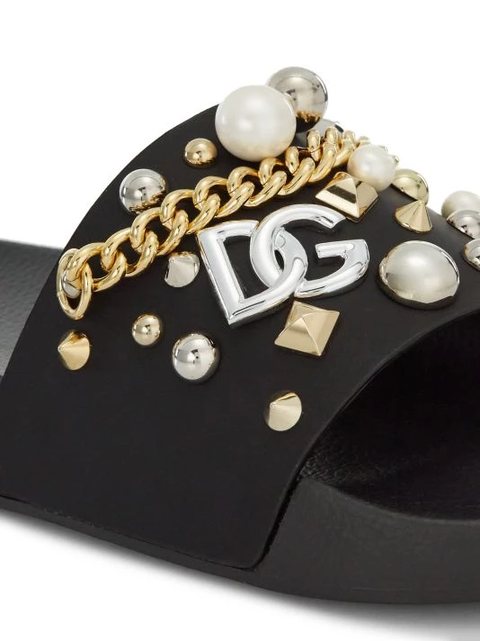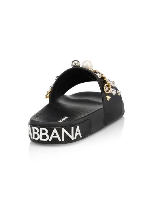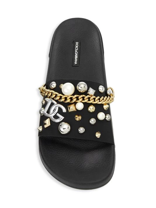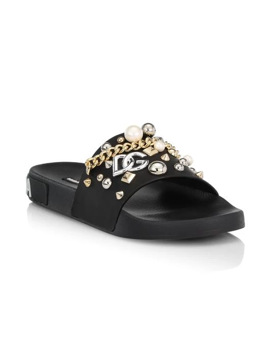 These slip-on slides are adorned with faux pearls, crystals, goldtone studs and a logo detail.