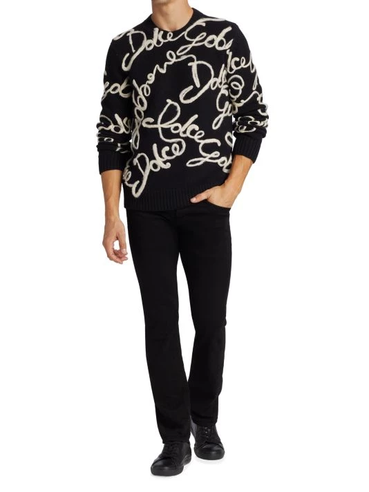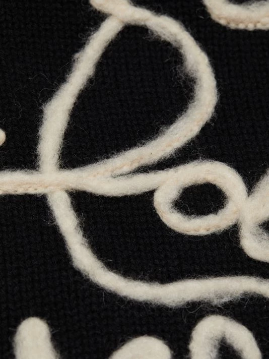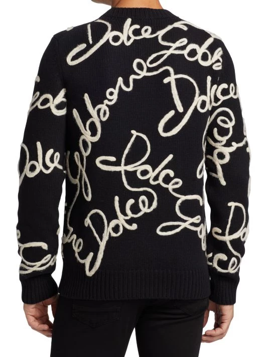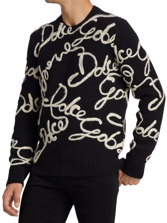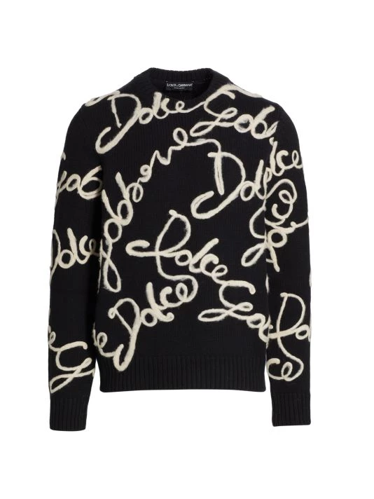 An all-over embroidered cursive logo pattern details this wool-blend sweater.