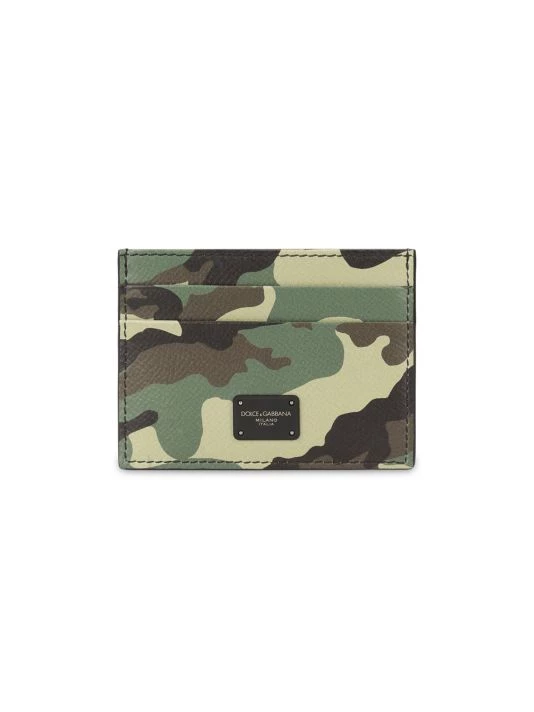 An allover camo-print and inscribed logo plaque enhance this leather card case.