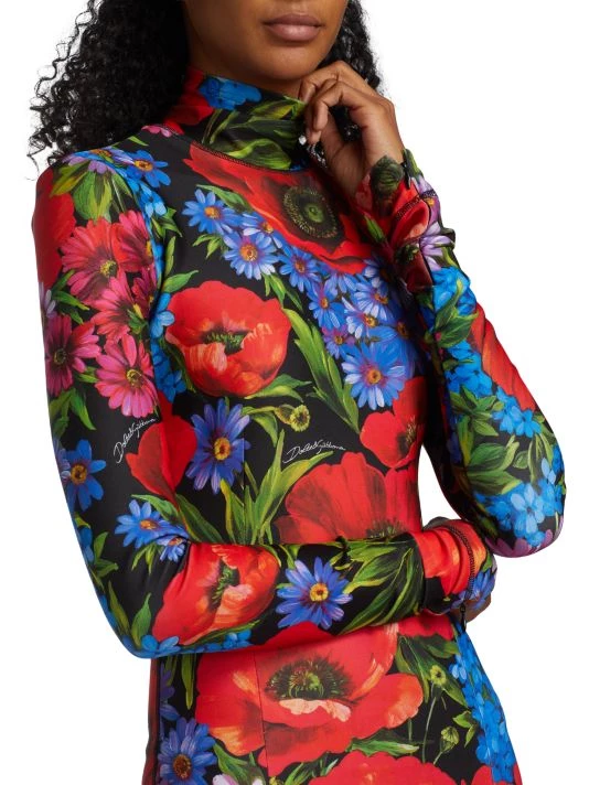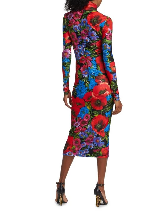 Cut in a body-con silhouette, DOLCE&GABBANA’s long-sleeve midi-dress is complete with a turtleneck and large painterly floral print.