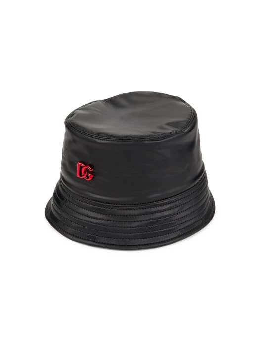 A metallic logo plaque centers this bucket hat, designed with a coated leather-like finish.