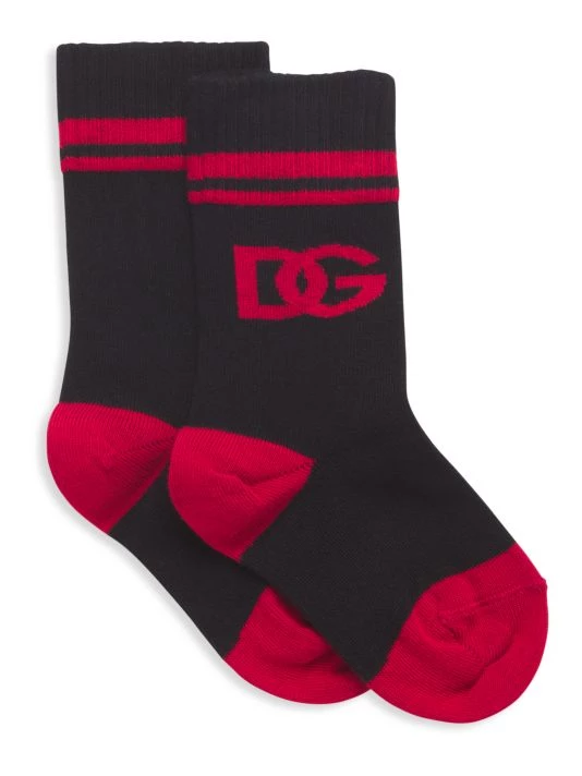 These ribbed socks are adorned with ‘DG’ intarsia and a striped pattern.