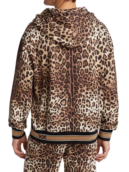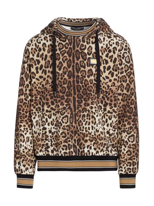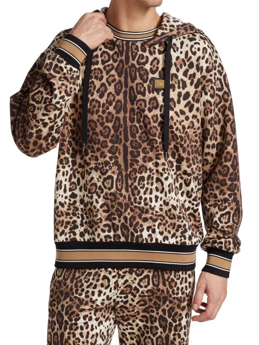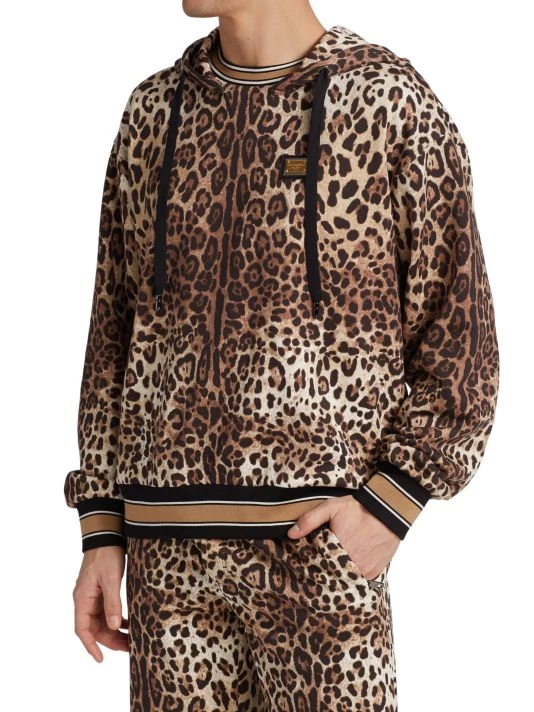 The brand’s signature leopard print contrasted by striped cuffs and a hem elevate this cotton hoodie.