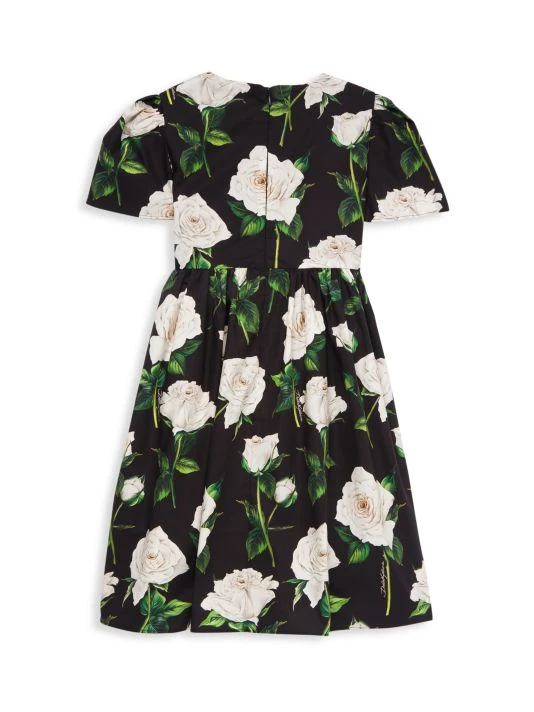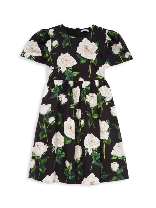 This fit-and-flare dress in a rose print features puff sleeves.