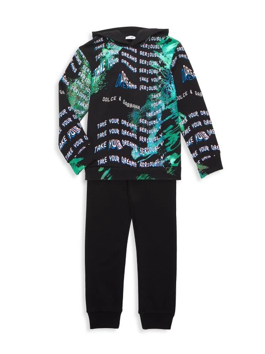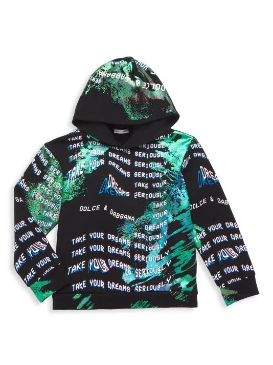 A fleece hoodie is adorned with “Take Your Dreams Seriously” digital-inspired print.