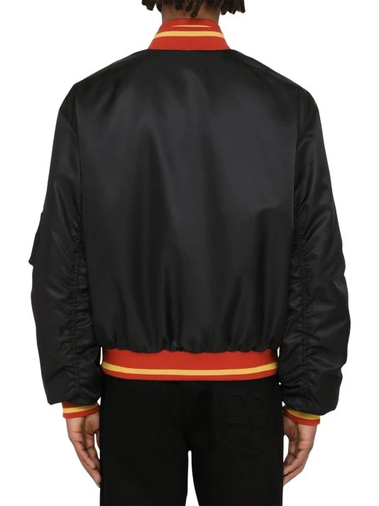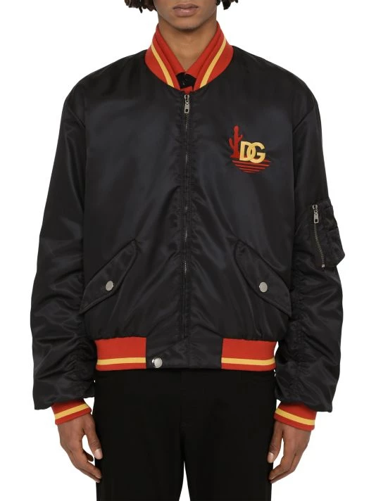 An embroidered cactus logo lends style to Dolce & Gabbana’s stripe-trim nylon bomber jacket.