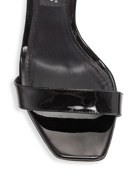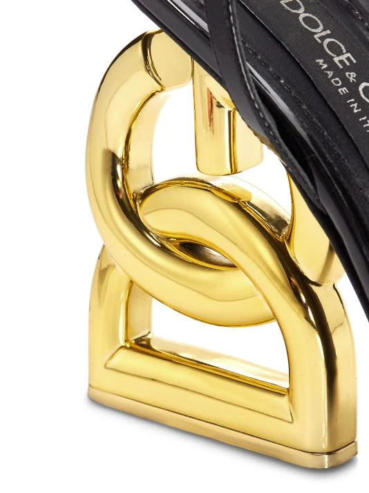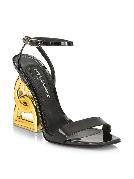 A bold metallic heel is sculpted into the iconic signature Dolce & Gabbana logo, anchoring these sleek square-toe sandals.