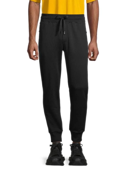 Cotton sweatpants featuring drawstring waistband, faux fly and two zipper seam pockets.