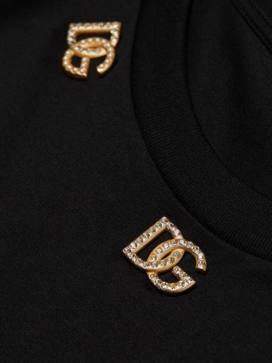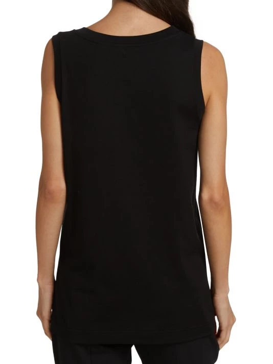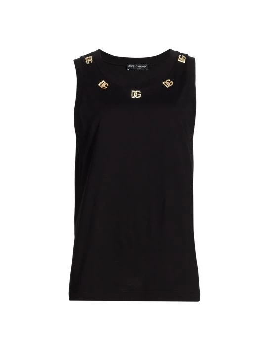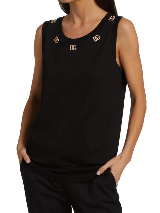 Relaxed fit tank top with goldtone metal and crystal-embellished branding at neckline.