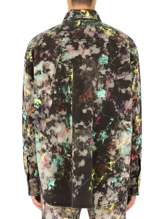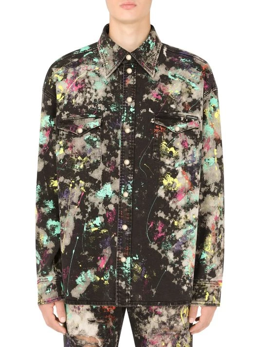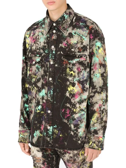 This denim jacket features a colorful paint splatter effect.