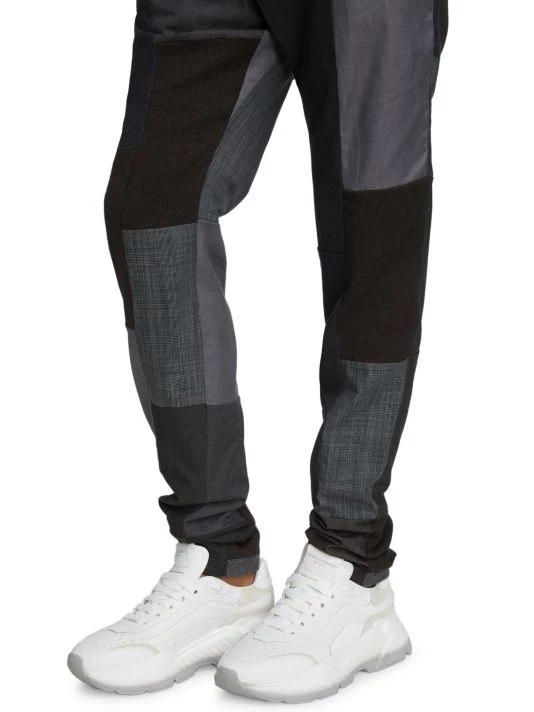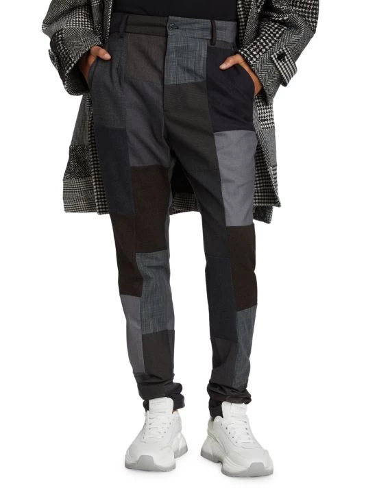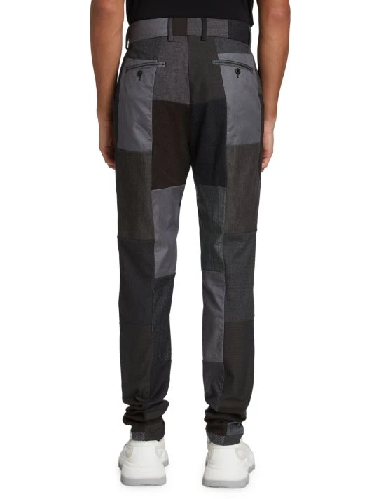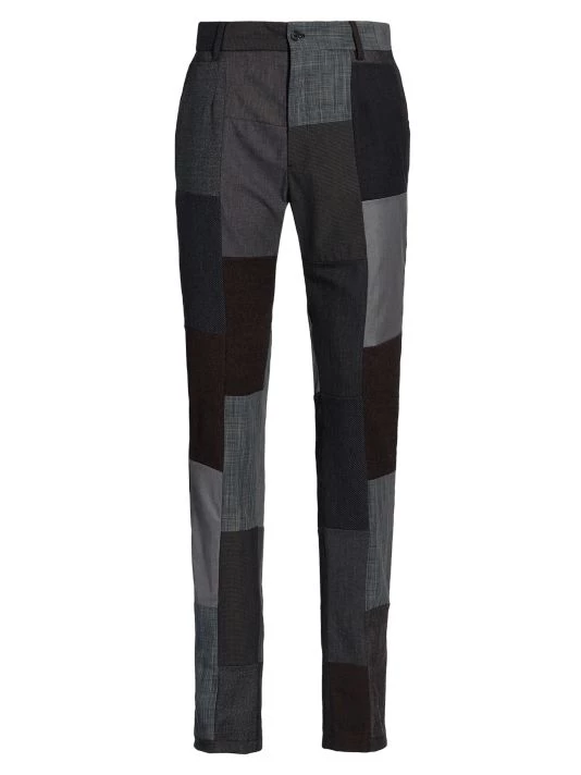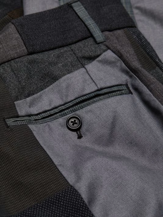 These patchwork pants feature side slip pockets and back buttoned welt pockets.