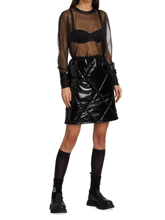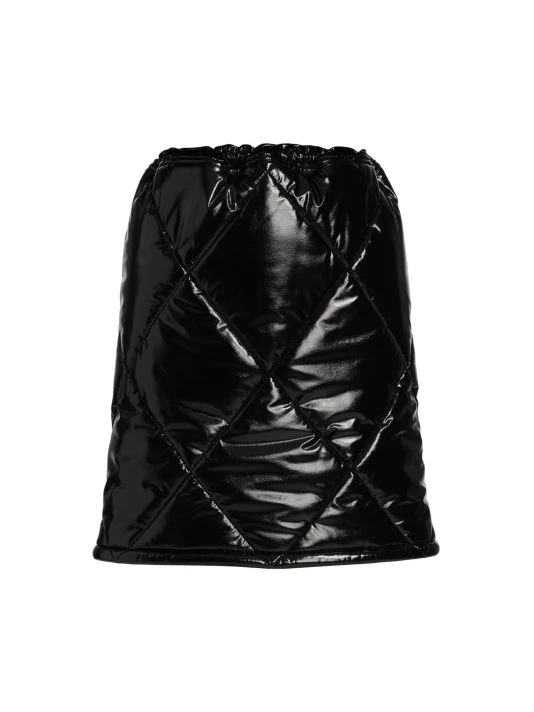 Quilted nylon mini-skirt with comfort elasticized waist and lustrous sheen.