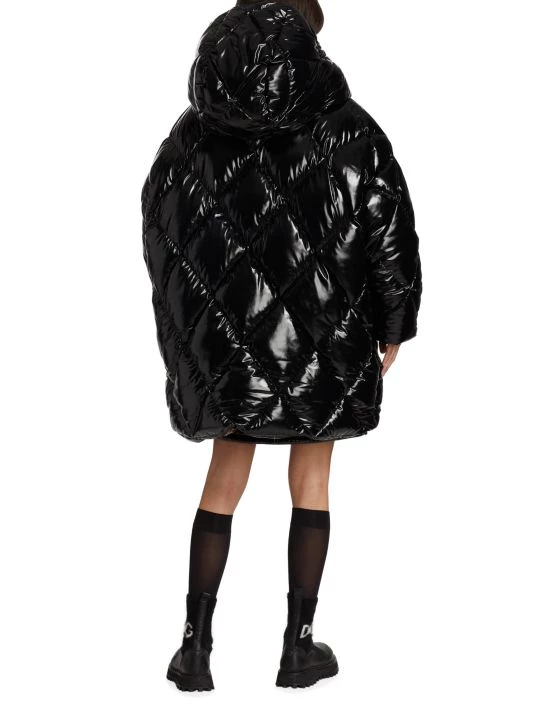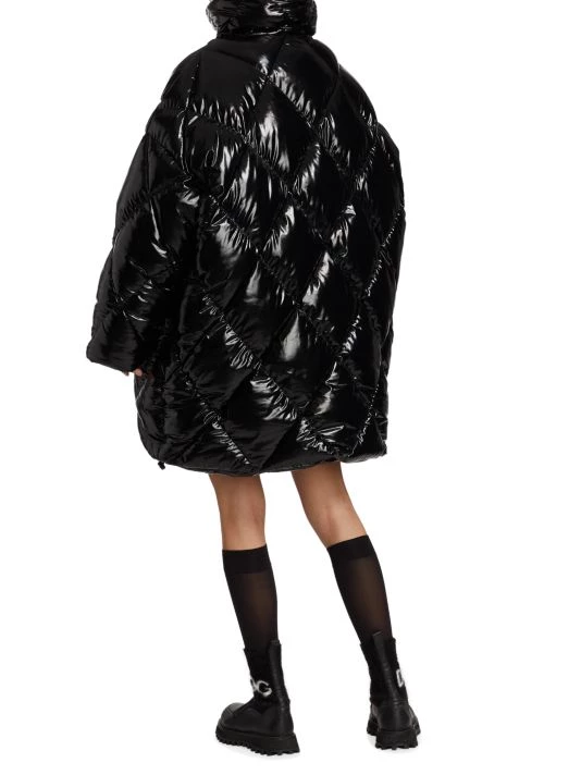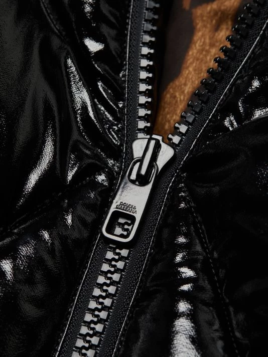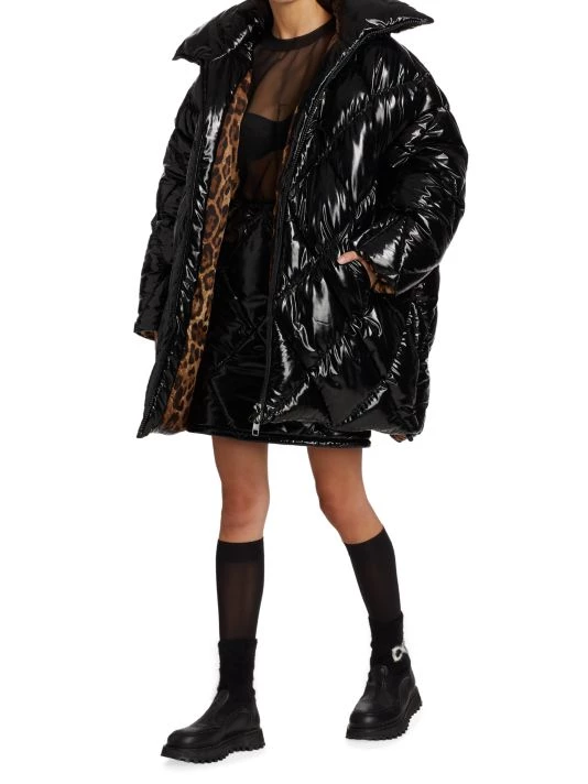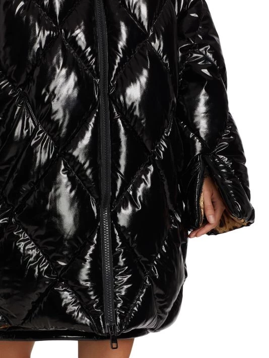 Quilted nylon puffer coat with a lustrous outer sheen and playful cheetah print lining.