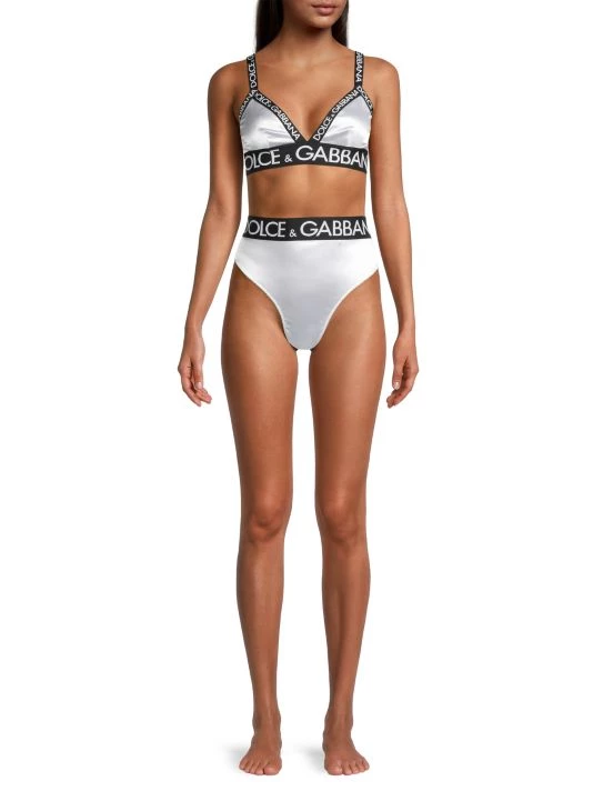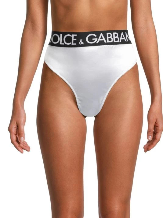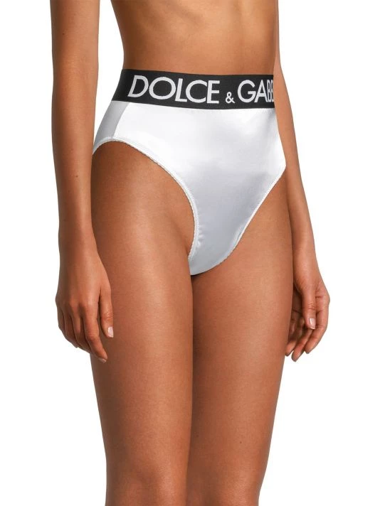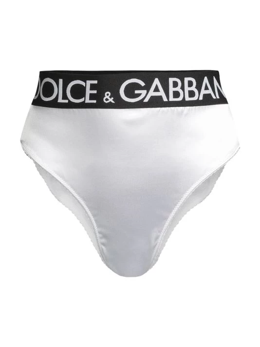 Sporty high-waisted brief with a satin finish features striking logo banding.