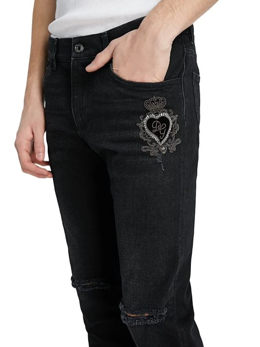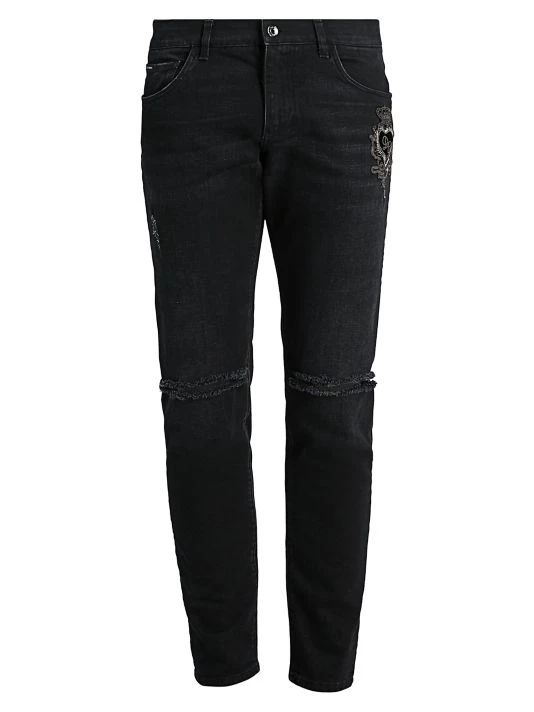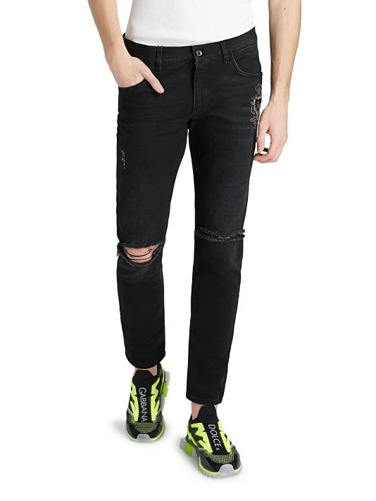 Slim-fit jeans featuring distressed, frayed knees and decorative side embroidery.
