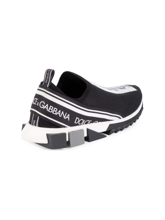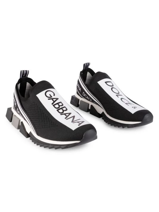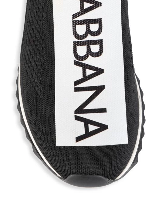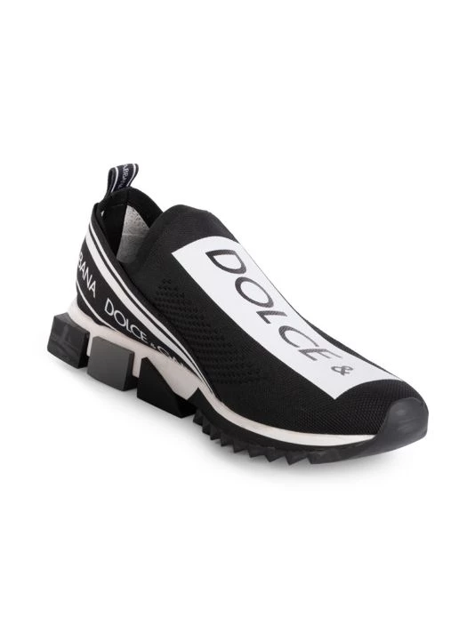 Mixed media knit sneakers feature bold logo graphics.
