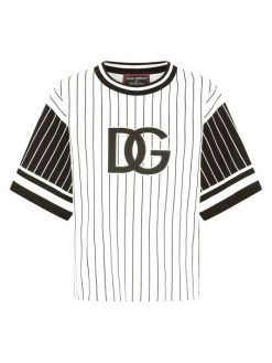 This sporty baseball-inspired T-shirt is adorned with pinstripe and contrasting short sleeves, fashioned with a monogram logo at the chest.