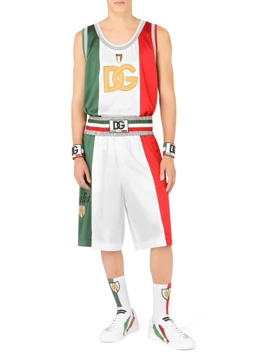 Tricolor vertical stripes define these glossy relaxed-fit satin shorts, designed with a logo-adorned waistband and inspired by classic athletic styles.