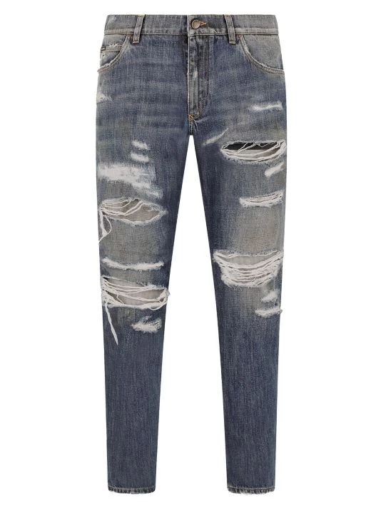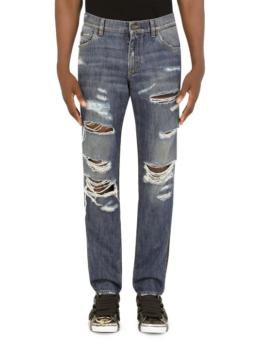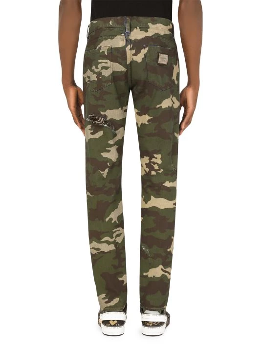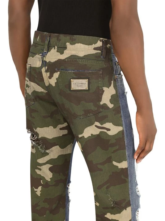 Heavily distressed jeans featuring a standard denim front half and a camo back half.