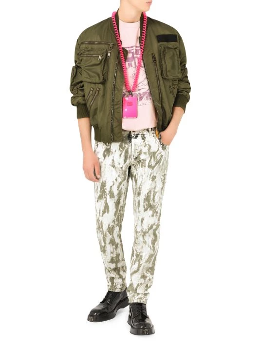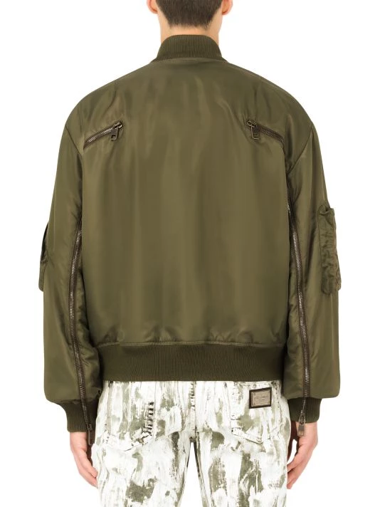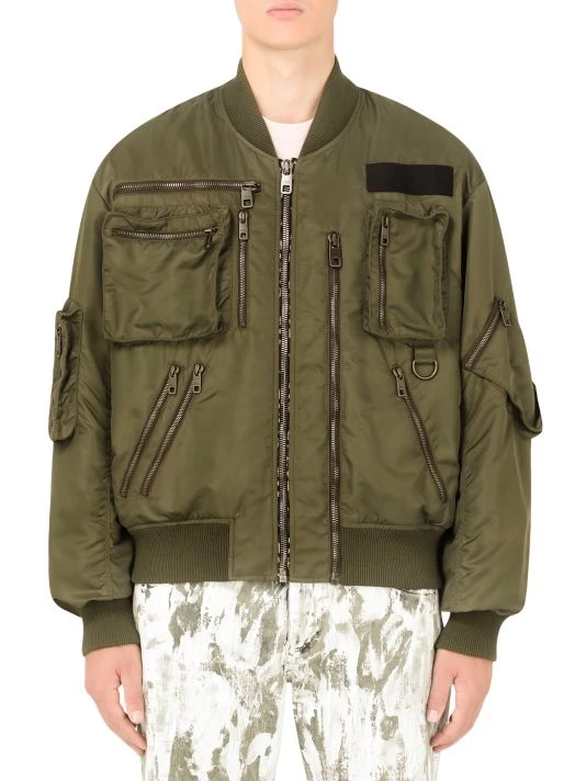 This bomber jacket features a standing collar and is adorned with zippered pockets at the chest, on the sides, and on the sleeves.